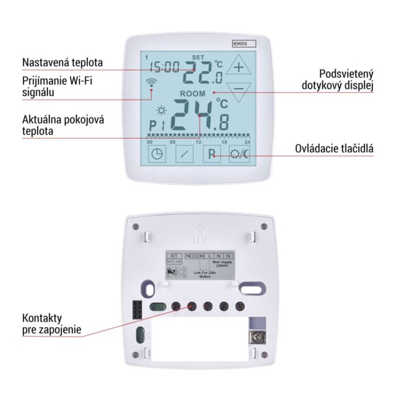 dĺžka kapilárneho čidla: –|dosah vo voľnom priestore: –|druh regulácie: vykurovací a chladiaci systém|farba: biela|funkcia ON/OFF: áno|funkcia prázdniny: áno|funkcia Set-back: nie|jazyky aplikácie: EN, CZ, SK, PL, DE, HU, SI, FR, + 60 ďalších jazykov|kalibrácia teploty: áno|kompatibilita: EMOS GoSmart, TUYA, LIDL, Smartlife, otvorený systém|meranie teploty: 0 °C až 40 °C, rozlíšenie 0,1 °C|možnosť prepojenia s ďalšími detektormi: nie|napájanie: 230 V AC|napájanie brány: –|napájanie prijímača: –|napájanie vysielača: –|nastavenie teploty: 7 ° C až 30 ° C, po 0,2 ° C|nastaviteľný rozptyl teploty: #|notifikácie do mobilnej aplikácie: áno|ochrana proti zamrznutiu: áno|ovládanie hlasovými asistentmi: áno (Amazon Alexa, Google Assistant)|počet programov: 6 + 3 užívateľsky nastaviteľné|podlahový senzor: NTC 10 k?, 3 m|podporované OS: Android, iOS|podsvietený displej: áno|pracovná frekvencia: –|predajný obal: 1 ks, krabička|prenosová frekvencia: 2,4 GHz WIFI (IEEE802.11b/g/n)|protokol: Wi-Fi|rozmer: 98 × 37 × 98 mm|rozmer brány: –|rozmer prijímača: –|rozmer vysielača: –|spínaná záťaž: 16 A odporovo, 5 A induktívne|spínanie: 230 V AC alebo beznapäťové|súčasť balenia: termostat, podlahové čidlo 3 m, O 8 mm|typ nastavenia teploty: komfortná a úsporná teplota|typ ovládania: programovateľný elektronický izbový termostat, možnosť ovládania cez mobil (iOS, Android)|typ termostatu: drôtový s OpenTherm komunikáciou + podlahové kúrenie