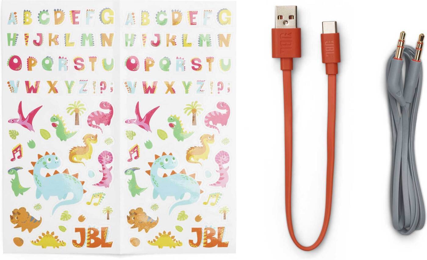 Balenie bez plastov sa dá zložiť do zábavného stojana na zariadenie a súčasťou balenia je aj hravá súprava samolepiek JBL, aby si deti mohli svoje slúchadlá prispôsobiť.