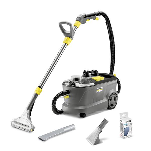 Profesionálny tepovač - extraktor Puzzi 10/1 Edition od Kärcher poskytuje vynikajúci sací výkon, hygienicky čisté výsledky čistenia a zaisťuje rýchle opätovné použitie textilných povrchov. Stroj pracuje na princípe nástreku vody a čistiaceho prostriedku do textílií pod tlakom, a na ich následnom odsatí, spolu s uvoľnenými nečistotami. Vďaka tomu je ideálny na čistenie čalúnenia, kobercov a iných textilných povrchov. Robustný, kompaktný dizajn Puzzi 10/1 Edition zaisťuje dlhú životnosť a tým aj vysokú hospodárnosť – ideálne pre dodávateľov stavebných služieb, hotelový a pohostinský sektor alebo na čistenie interiérov vozidiel. Veko stroja, hubica na čalúnenie a podlahová hubica sú priehľadné pre lepšie sledovanie stupňa znečistenia pri čistení. Pohodlie pre užívateľa zvyšujú aj veľké tlačidlá, ktoré možno ovládať rukou alebo nohou. Príslušenstvo zahrnuté v rozsahu dodávky je obzvlášť štedré: 240 mm hubica na koberce, hubica na čalúnenie, štrbinová hubica a 48 ks tabliet RM 760.