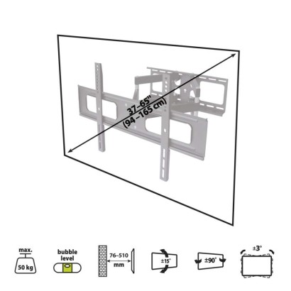 druh držiaka: konzolový|garantované rozmedzie rozteče obrazovky: 37–65" (94–165 cm)|max. montážne rozmery VESA: 600 × 400 mm|max. nosnosť (kg): 50|min. montážne rozmery VESA: 200 × 200 mm|naklopenie: +/-15°|predajný obal: 1 ks, papierová krabica|profil od steny: 76–510 mm|rotácia: +/-3°|rozmer: 510 × 650 × 204 mm|spôsob fixácie: skrutka|vodováha súčasťou balenia: áno|vyrovnanie: nie|vytočenie: +/- 90°