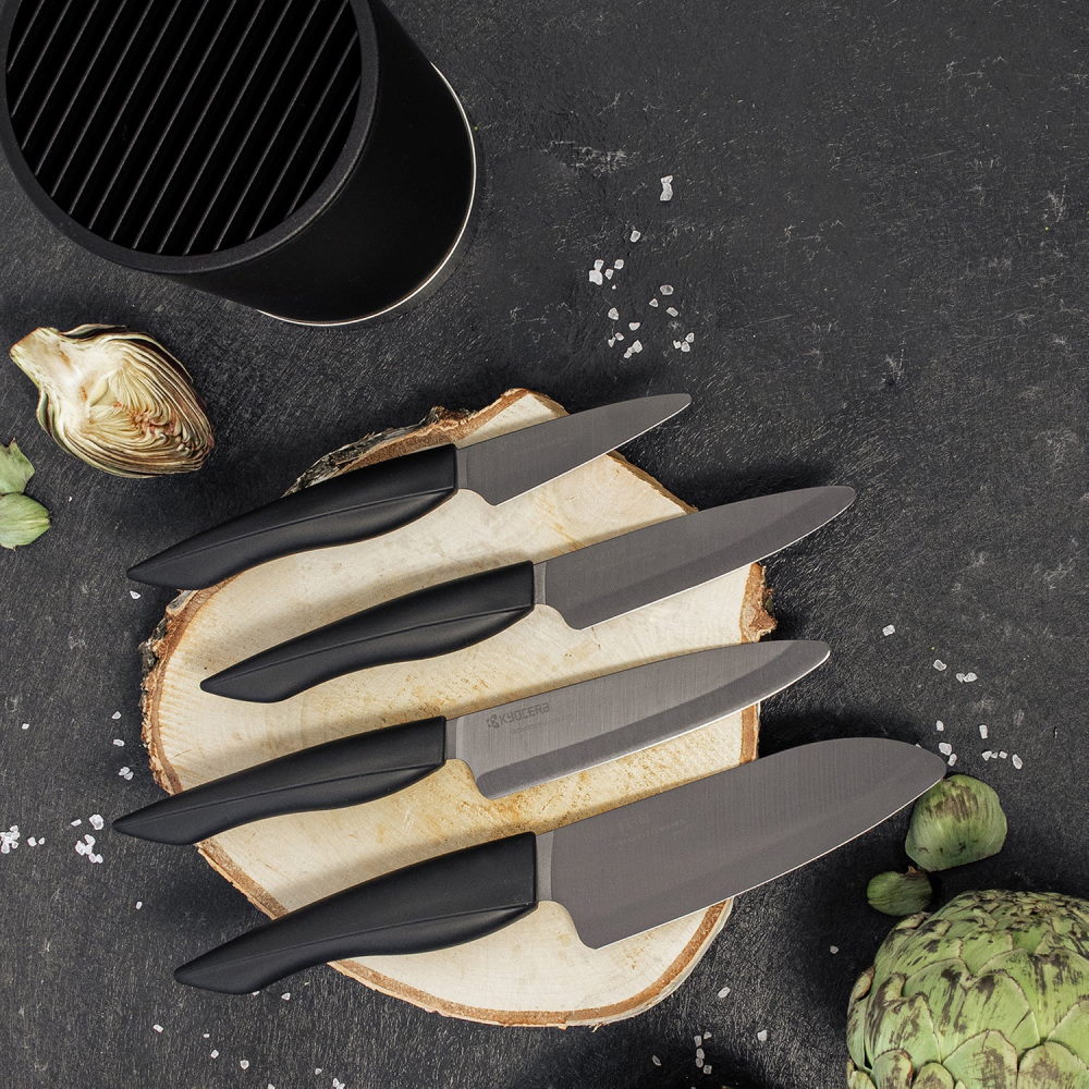 Sada keramických nožů Shin obsahuje japonský kuchařský nůž Santoku (14 cm), nůž na zeleninu a ovoce (11 cm), univerzální nůž (13 cm) a nůž na zeleninu (7,5 cm). Součástí této sady je elegantní a praktický stojan z měkkého plastu, který pojme 6–8 kuchyňských nožů.Blok na nože je vyroben z měkkého plastu (soft-touch) a krásně vypadá také prémiový pásek z nerezové oceli s vygravírovaným logem Kyocera. Údržba je snadná díky odnímatelné horní části se štěrbinami.