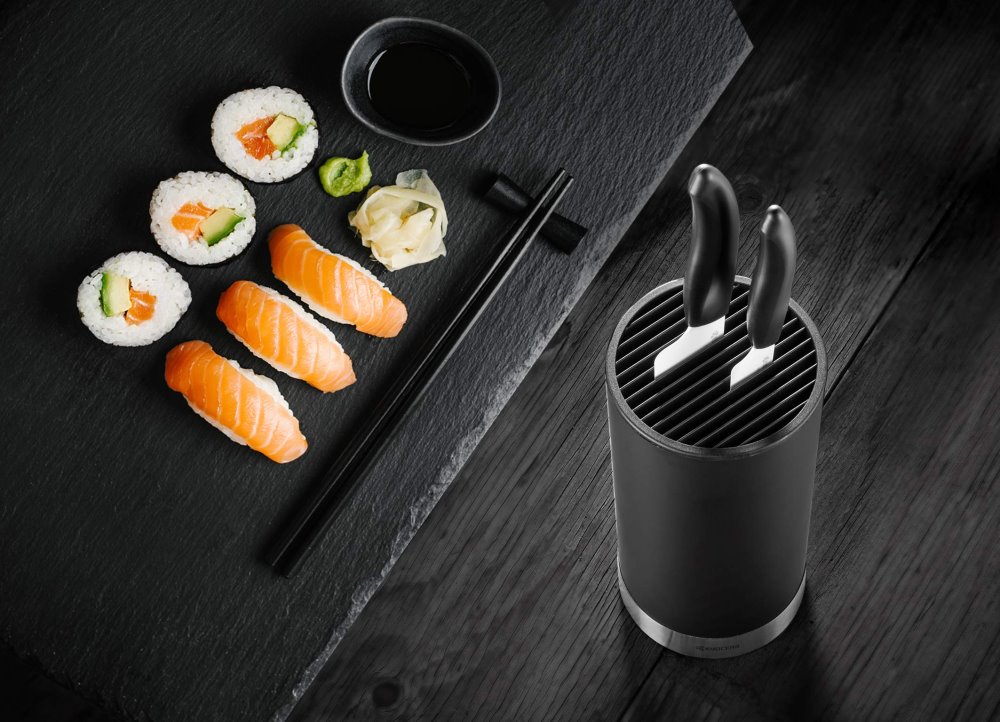 Designový kulatý blok s otvory pro nože, do kterých lze bezpečně uložit 6–8 nožů, a které jsou obzvláště šetrné k čepeli.
