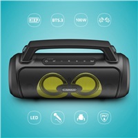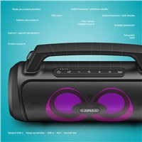 Přenosný Bluetooth party reproduktor s madlem, BT 5.3, výkon 100 W, 3 režimy LED podsvícení, 20 hodin výdrž, ovládání přes zařízení s iOS nebo Android, drátový mikrofon v balení, LAMAX BeatBass®, voděodolnost IP67, 6,3 mm jack, SD karta, USB-A vstup, TWS