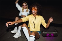 Přenosný Bluetooth party reproduktor s madlem, BT 5.3, výkon 100 W, 3 režimy LED podsvícení, 20 hodin výdrž, ovládání přes zařízení s iOS nebo Android, drátový mikrofon v balení, LAMAX BeatBass®, voděodolnost IP67, 6,3 mm jack, SD karta, USB-A vstup, TWS funkce pro připojení druhého reproduktoru.