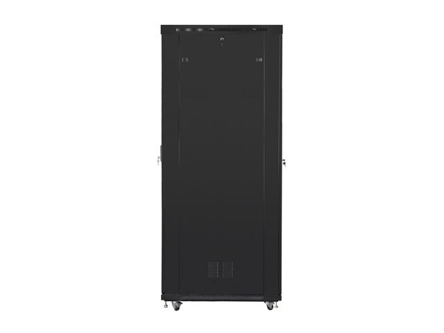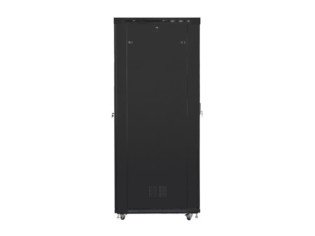 Konstrukce skříně je vyrobena z vysoce kvalitní válcované oceli, která poskytuje vynikající design a řemeslné zpracování. Má nastavitelnou hloubku vertikálních montážních lišt pro umístění různých typů zařízení. Zemnící příslušenství je součástí dodávky, včetně kabelu a matic. Zemnící kolíky jsou umístěny ve třech částech rozvaděče - rámu, předních dveřích a zadních dveřích a zajišťují komplexní uzemnění instalace. Skříň Lanberg má také uzamykatelné horní a spodní panely se záslepkami pro pohodlné zavádění kabelů a jejich skrytí. To zajišťuje úhlednou a dobře organizovanou instalaci a minimalizuje změť kabelů. Skříň je navíc vybavena prosklenými předními dvířky a kovovými zadními dvířky. Nabízí možnost montáže dveří na pravou nebo levou stranu. Boční panely jsou odnímatelné (včetně zámků) a zadní dveře jsou masivní ocelové se zámkem. Skříň má také přední LCD displej s funkcí termostatu, zobrazující důležité informace, jako je vnitřní teplota, aktuální čas a stav ventilátoru.
