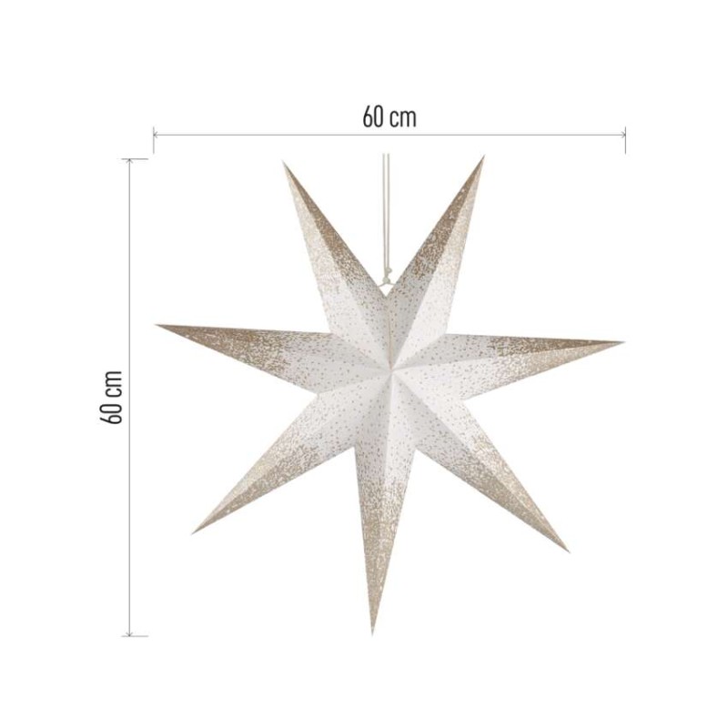 časovač: nie|diaľkový ovládač: nie|dĺžka prívodu: 3,2 m|farba drôtu: biela|farba svetla: neuvádza sa|krytie: IP20|materiál: papier|počet LED: neuvádza sa|použitie: vnútorné|predajný obal: 1 ks, krabica|príkon: neuvádza sa|produkt: hviezda|rozmer: 60 cm|typ napájania: sieť|vstupné napätie: 230 V AC|výstupné napätie: neuvádza sa|záručná doba: 2 roky|zdroj svetla: E14|životnosť: 10 000 hodín