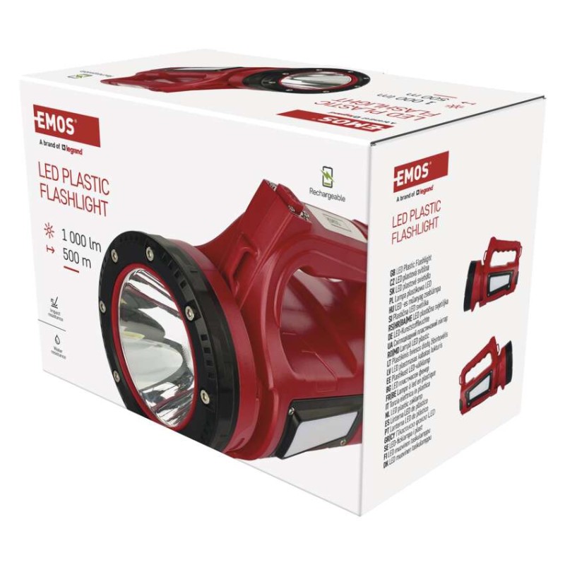 batérie súčasťou balenia: áno|doba nabíjania: 10 h|doba svietenia: 10–22 h|doba svietenia detail: SMD LED 100 % – 10 h, SMD LED 40 % – 12 h, SMD LED 20 % – 15,5 h, COB LED 100 % – 18,5 h, COB LED 30 % – 22 h|dosvit: SMD LED 100 % – 500 m, SMD LED 40 % – 300 m, SMD LED 20 % – 200 m, COB LED 100 % – 20 m, COB LED 30 % – 15 m|farba: červeno-čierna|fokus: nie|hmotnosť: 781 g|LED indikácia nabíjania: áno|LED indikácia stavu akumulátora: áno|materiál: ABS plast + hliník|maximálny dosvit: 500 m|maximálny svetelný tok: 1 000 lm|nabíjací: áno|napájanie: Li-Ion akupack|nárazuvzdornosť: áno|počet režimov svietenia: 8+|predajný obal: 1 ks, papierová krabička|príslušenstvo: USB kábel, popruh|režimy: SMD LED 100 %, SMD LED 40 %, SMD LED 20 %, SMD LED blikanie, COB LED 100 % – biela, COB LED 30 % – biela, COB LED červená, COB LED červená – blikanie|rozmer: 205 × 102 × 148 mm|špeciálna funkcia: funkcie powerbank, funkcia rýchleho vypnutia, funkcia ochrany batérie|svetelný tok: SMD LED 100 % – 1 000 lm, SMD LED 40 % – 380 lm, SMD LED 20 % – 190 lm, COB LED 100 % – 250 lm, COB LED 30 % – 75 lm|typ batérie: 15 000 mAh/3,7 V|typ napájacieho konektoru: USB C|vodeodolná: IP44|vybavenie: LCD indikácia, závit na statív|záručná doba: 2 roky|zdroj svetla: SMD LED + 2× COB LED|značka: EMOS