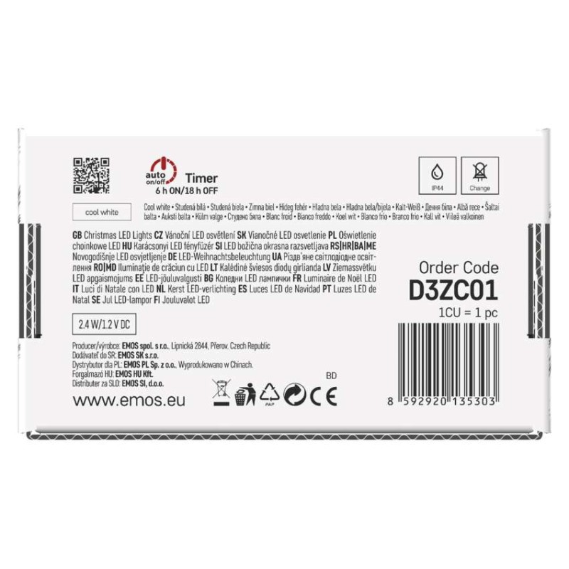 časovač: áno|diaľkový ovládač: nie|dĺžka prívodu: 3 m|farba drôtu: strieborná|farba svetla: studená biela|funkcia: svieti|krytie: IP44|LED medzera: 10 cm|materiál: kov|možnosť prepojenia: nie|počet LED: 120|použitie: vonkajšie aj vnútorné|predajný obal: 1 ks, krabica|pre výšku stromu: neuvádza sa|príkon: 2,4 W|produkt: nano reťaz|rozmer: 12 m|tvar: nano|typ napájania: batéria (1× NiMH, 600 mAh, AA) Solar|veľkosť LED: micro LED|vstupné napätie: 1,2 V DC|výstupné napätie: neuvádza sa|záručná doba: 2 roky|životnosť: 10 000 hodín
