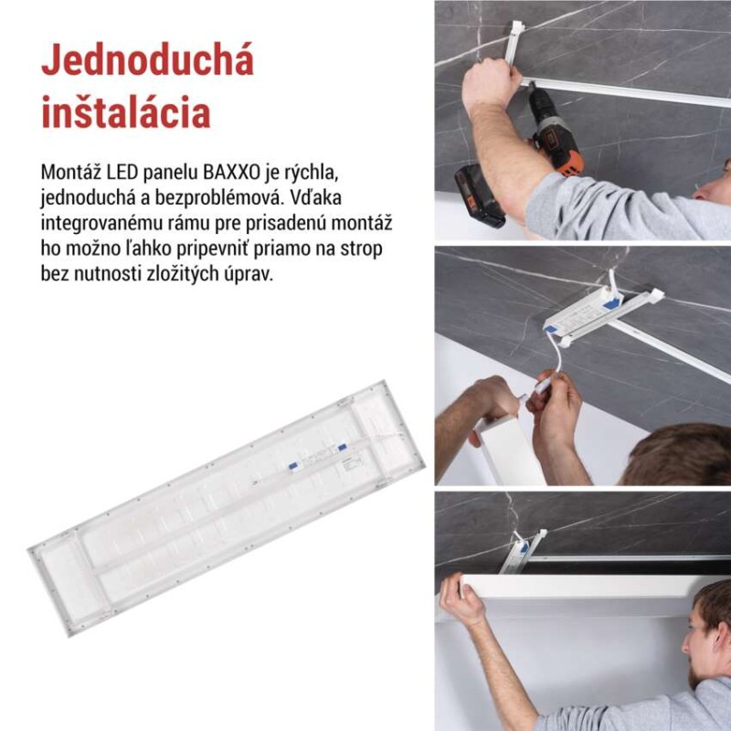ďalšie funkcie: –|diaľkový ovládač: nie|do chodby a na schodisko: áno|do dielne a garáže: nie|do kancelárie: áno|do kuchyne: áno|do kúpeľne: nie|do obývačky, spálne a detskej izby: áno|dosah senzora: nemá senzor|do záhrady a na balkón: nie|farba svetla: neutrálna biela|farba tela: biela|flicker-free: áno|frekvencia: 50/60 Hz|index podania farieb (CRI): Ra > 80|jazyky aplikácie: –|kategória: PROFI|kompatibilita: –|krytie: IP20|materiál difúzora: plast (PS)|materiál LGP: neuvádza sa|materiál tela: oceľový plech|montážny otvor: neuvádza sa|možnosť stmievania: nie|náhrada za žiarovku: 4× 18 W CFL|napätie: 220–240 V~|notifikácie do mobilnej aplikácie: nie|obsah balenia: –|ovládanie hlasovými asistentmi: nie|podporované OS: –|pohybový senzor: nie|predajný obal: 1 ks, krabica|prenosová frekvencia: –|príkon: 36 W|protokol: –|prúd: 170 mA|rada: BAXXO|rozmer: 1 200 × 300 × 50 mm|spôsob montáže: prisadené|svetelná účinnosť: 120 lm/W|svetelný tok: 4 320 lm|teplota chromatičnosti: 4 000 K|tvar: obdĺžnik|typ difúzora: mliečny|typ svietidla: panel|účinník: > 0,9|UGR<: 22|uhol vyžarovania: 120°|umiestnenie: stropné/nástenné|výstupný prúd zo zdroja: 950 mA|záručná doba: 5 rokov|zdroj svetla: LED|životnosť: 50 000 hodín