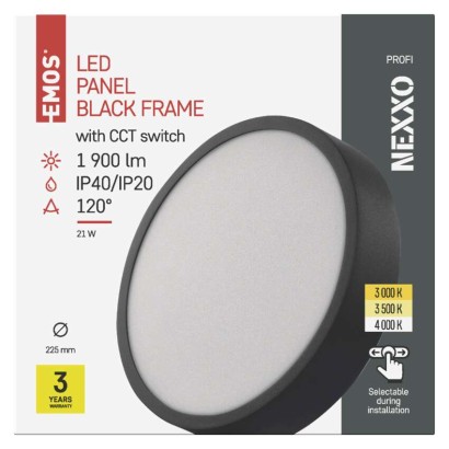 diaľkový ovládač: nie|do chodby a na schodisko: áno|do dielne a garáže: nie|do kancelárie: áno|do kuchyne: áno|do kúpeľne: nie|do obývačky, spálne a detskej izby: áno|dosah senzora: nemá senzor|do záhrady a na balkón: nie|farba svetla: teplá biela–neutrálna biela|farba tela: čierna|flicker-free: nebliká|frekvencia: 50/60 Hz|index podania farieb (CRI): Ra > 80|kategória: PROFI|krytie: IP40/IP20|materiál difúzora: plast (PMMA)|materiál LGP: PMMA|materiál tela: oceľový plech|montážny otvor: neuvádza sa|možnosť stmievania: nie|náhrada za žiarovku: 120 W|napätie: 220–240 V|pohybový senzor: nie|predajný obal: 1 ks, krabica|príkon: 21 W|prúd: 500 mA|rada: NEXXO|rozmer: priemer 225 × 42 mm|spôsob montáže: prisadené|svetelná účinnosť: 90 lm/W|svetelný tok: 1 900 lm|teplota chromatičnosti: 3 000/3 500/4 000 K|tvar: kruh|typ difúzora: mliečny|typ svietidla: klasické svietidlo|účinník: > 0,9|UGR<: neuvádza sa|uhol vyžarovania: 120°|umiestnenie: stropné/nástenné|výstupný prúd zo zdroja: neuvádza sa|záručná doba: 3 roky|zdroj svetla: LED|životnosť: 30 000 hodín