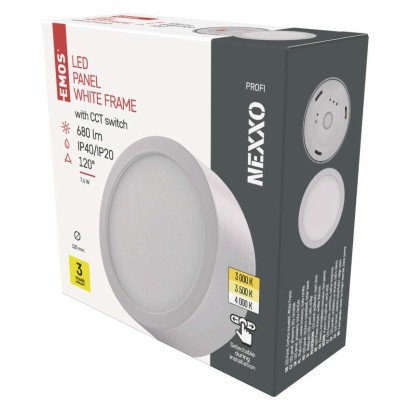 diaľkový ovládač: nie|do chodby a na schodisko: áno|do dielne a garáže: nie|do kancelárie: áno|do kuchyne: áno|do kúpeľne: nie|do obývačky, spálne a detskej izby: áno|dosah senzora: nemá senzor|do záhrady a na balkón: nie|farba svetla: teplá biela–neutrálna biela|farba tela: biela|flicker-free: nebliká|frekvencia: 50/60 Hz|index podania farieb (CRI): Ra > 80|kategória: PROFI|krytie: IP40/IP20|materiál difúzora: plast (PMMA)|materiál LGP: PMMA|materiál tela: oceľový plech|montážny otvor: neuvádza sa|možnosť stmievania: nie|náhrada za žiarovku: 50 W|napätie: 220–240 V|pohybový senzor: nie|predajný obal: 1 ks, krabica|príkon: 7,6 W|prúd: 300 mA|rada: NEXXO|rozmer: priemer 120 × 40 mm|spôsob montáže: prisadené|svetelná účinnosť: 90 lm/W|svetelný tok: 680 lm|teplota chromatičnosti: 3 000/3 500/4 000 K|tvar: kruh|typ difúzora: mliečny|typ svietidla: klasické svietidlo|účinník: > 0,5|UGR<: neuvádza sa|uhol vyžarovania: 120°|umiestnenie: stropné/nástenné|výstupný prúd zo zdroja: neuvádza sa|záručná doba: 3 roky|zdroj svetla: LED|životnosť: 30 000 hodín
