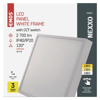 diaľkový ovládač: nie|do chodby a na schodisko: áno|do dielne a garáže: nie|do kancelárie: áno|do kuchyne: áno|do kúpeľne: nie|do obývačky, spálne a detskej izby: áno|dosah senzora: nemá senzor|do záhrady a na balkón: nie|farba svetla: teplá biela–neutrálna biela|farba tela: biela|flicker-free: nebliká|frekvencia: 50/60 Hz|index podania farieb (CRI): Ra > 80|kategória: PROFI|krytie: IP40/IP20|materiál difúzora: plast (PMMA)|materiál LGP: PMMA|materiál tela: oceľový plech|montážny otvor: neuvádza sa|možnosť stmievania: nie|náhrada za žiarovku: 160 W|napätie: 220–240 V|pohybový senzor: nie|predajný obal: 1 ks, krabica|príkon: 28,5 W|prúd: 700 mA|rada: NEXXO|rozmer: 300 × 300 × 42 mm|spôsob montáže: prisadené|svetelná účinnosť: 95 lm/W|svetelný tok: 2 700 lm|teplota chromatičnosti: 3 000/3 500/4 000 K|tvar: štvorec|typ difúzora: mliečny|typ svietidla: klasické svietidlo|účinník: > 0,9|UGR<: neuvádza sa|uhol vyžarovania: 120°|umiestnenie: stropné/nástenné|výstupný prúd zo zdroja: neuvádza sa|záručná doba: 3 roky|zdroj svetla: LED|životnosť: 30 000 hodín