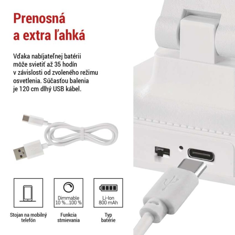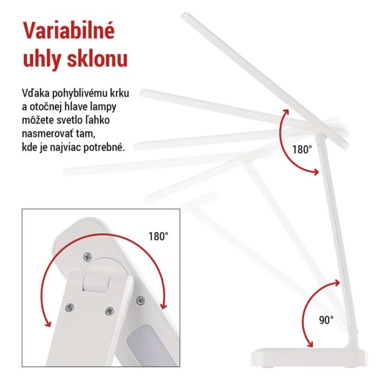 činiteľ starnutia: 0,96|čip LED: SMD|dĺžka prívodného kábla: 1,2 m|energetická trieda: neuvádza sa|energetická trieda (od 1.9.2021): neuvádza sa|farba: biela|farba svetla: teplá/neutrálna/studená biela|index podania farieb (CRI): Ra >80|integrovaná nabíjacia batéria: áno|krytie: IP20|materiál: ABS plast|max. výkon: 5 W|napájacie trafo: USB|napájací zdroj súčasťou balenia: nie|napätie: 5 V|obsah ortuti: neuvádza sa|pätica (uchytenie žiarovky): neuvádza sa|počet LED: neuvádza sa|počet spínacích cyklov: neuvádza sa|predajný obal: 1 ks, krabica|príkon: 5 W|rozmer: 250 × 240 mm|rýchlosť nábehu na 100 %: neuvádza sa|stmievanie: áno|svetelný tok: 200 lm|teplota chromatičnosti: 3 000–6 500 K|typ napájania: USB|účinník: neuvádza sa|USB port: nie|životnosť: neuvádza sa