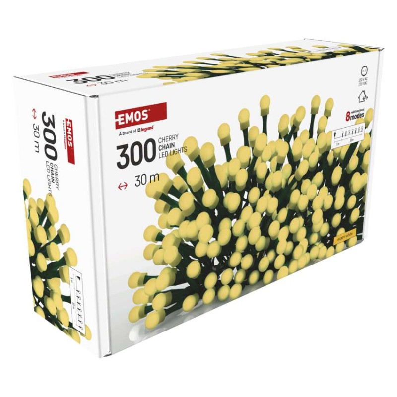 časovač: áno|ďalšie funkcie: –|diaľkový ovládač: nie|dĺžka prívodu: 5 m|farba drôtu: zelená|farba svetla: teplá biela|funkcia: 8 módov (multifunkcie)|jazyky aplikácie: –|kompatibilita: –|krytie: IP44|LED medzera: 10 cm|materiál: PVC|možnosť prepojenia: nie|notifikácie do mobilnej aplikácie: nie|ovládanie hlasovými asistentmi: nie|počet LED: 300|podporované operačné systémy: –|použitie: vonkajšie aj vnútorné|predajný obal: 1 ks, krabica|prenosová frekvencia: –|pre výšku stromu: 250 cm|príkon: 6 W|produkt: reťaz|protokol: –|rozmer: 30 m|tvar: gulička|typ napájania: sieťový adaptér|veľkosť LED: 10 mm|vstupné napätie: 230 V AC|výstupné napätie: 31 V DC|záručná doba: 2 roky|životnosť: 10 000 hodín