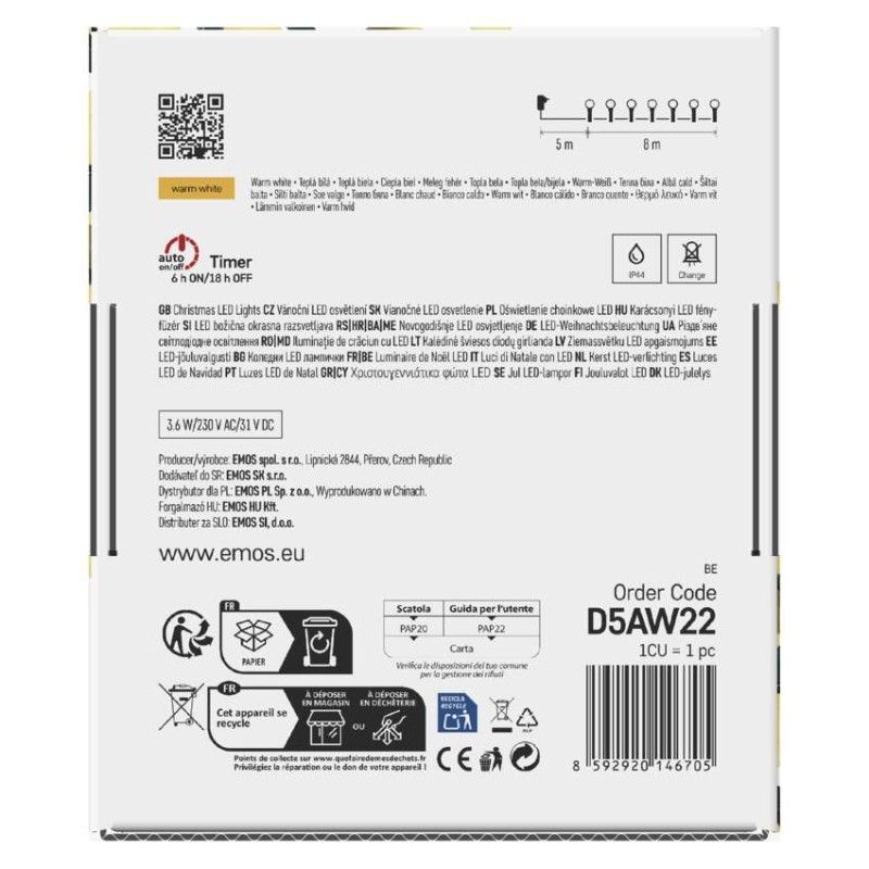 časovač: áno|ďalšie funkcie: –|diaľkový ovládač: nie|dĺžka prívodu: 5 m|farba drôtu: zelená|farba svetla: teplá biela|funkcia: 8 módov (multifunkcie)|jazyky aplikácie: –|kompatibilita: –|krytie: IP44|LED medzera: 10 cm|materiál: PVC|možnosť prepojenia: nie|notifikácie do mobilnej aplikácie: nie|ovládanie hlasovými asistentmi: nie|počet LED: 80|podporované operačné systémy: –|použitie: vonkajšie aj vnútorné|predajný obal: 1 ks, krabica|prenosová frekvencia: –|pre výšku stromu: 140 cm|príkon: 3,6 W|produkt: reťaz|protokol: –|rozmer: 8 m|tvar: gulička|typ napájania: sieťový adaptér|veľkosť LED: 10 mm|vstupné napätie: 230 V AC|výstupné napätie: 31 V DC|záručná doba: 2 roky|životnosť: 10 000 hodín