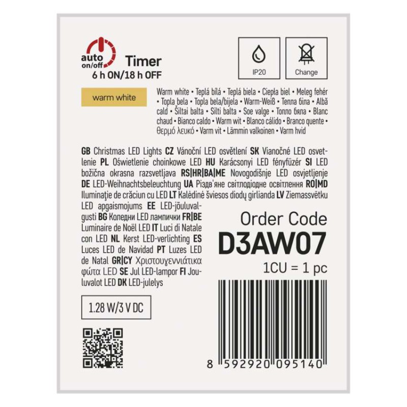 časovač: áno|diaľkový ovládač: nie|dĺžka prívodu: 0,5 m|farba drôtu: medená|farba svetla: teplá biela|funkcia: svieti|krytie: IP20|LED medzera: 10 cm|materiál: kov|možnosť prepojenia: nie|počet LED: 20|použitie: vnútorné|predajný obal: 1 ks, krabica|pre výšku stromu: neuvádza sa|príkon: 1,28 W|produkt: nano reťaz|rozmer: 1,9 m|tvar: nano|typ napájania: batéria (2× AA)|veľkosť LED: 3 mm (nano)|vstupné napätie: neuvádza sa|výstupné napätie: 3 V DC|záručná doba: 2 roky|životnosť: 10 000 hodín