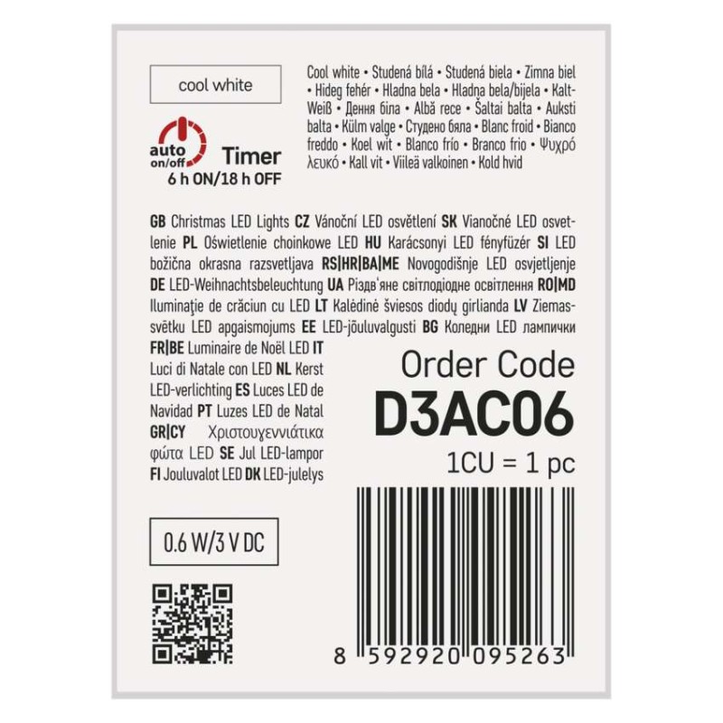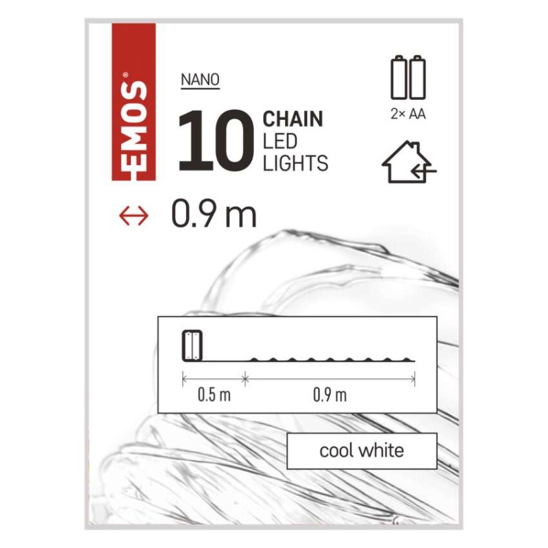 časovač: áno|diaľkový ovládač: nie|dĺžka prívodu: 0,3 m|farba drôtu: strieborná|farba svetla: studená biela|funkcia: svieti|krytie: IP20|LED medzera: 10 cm|materiál: kov|možnosť prepojenia: nie|počet LED: 10|použitie: vnútorné|predajný obal: 1 ks, krabica|pre výšku stromu: neuvádza sa|príkon: 0,6 W|produkt: reťaz|rozmer: 0,9 m|tvar: klasický|typ napájania: batéria (2× AA)|veľkosť LED: micro LED|vstupné napätie: neuvádza sa|výstupné napätie: 3 V DC|záručná doba: 2 roky|životnosť: 10 000 hodín