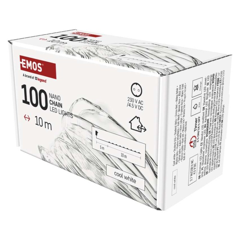 časovač: áno|diaľkový ovládač: nie|dĺžka prívodu: 5 m|farba drôtu: strieborná|farba svetla: studená biela|funkcia: svieti|krytie: IP44|LED medzera: 10 cm|materiál: kov|možnosť prepojenia: nie|počet LED: 100|použitie: vonkajšie aj vnútorné|predajný obal: 1 ks, krabica|pre výšku stromu: 160 cm|príkon: 3,6 W|produkt: nano reťaz|rozmer: 10 m|tvar: nano|typ napájania: sieťový adaptér|veľkosť LED: 3 mm (nano)|vstupné napätie: 230 V AC|výstupné napätie: neuvádza sa|záručná doba: 2 roky|životnosť: 10 000 hodín