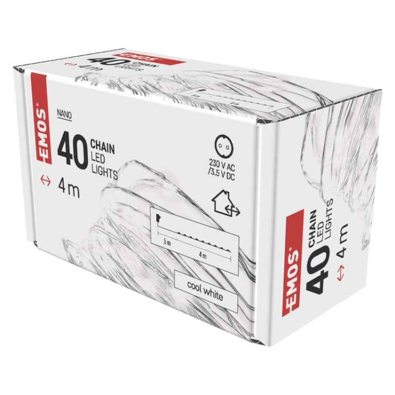 časovač: áno|diaľkový ovládač: nie|dĺžka prívodu: 5 m|farba drôtu: strieborná|farba svetla: studená biela|funkcia: svieti|krytie: IP44|LED medzera: 10 cm|materiál: kov|možnosť prepojenia: nie|počet LED: 40|použitie: vonkajšie aj vnútorné|predajný obal: 1 ks, krabica|pre výšku stromu: 100 cm|príkon: 2,4 W|produkt: nano reťaz|rozmer: 4 m|tvar: nano|typ napájania: sieťový adaptér|veľkosť LED: 3 mm (nano)|vstupné napätie: 230 V AC|výstupné napätie: neuvádza sa|záručná doba: 2 roky|životnosť: 10 000 hodín