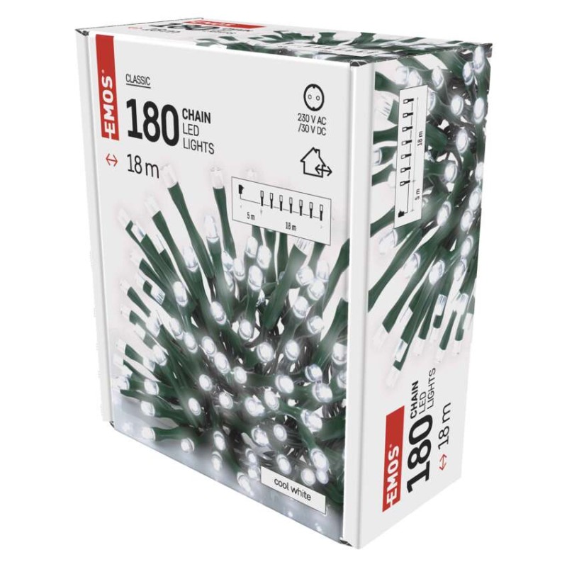 časovač: áno|diaľkový ovládač: nie|dĺžka prívodu: 5 m|farba drôtu: zelená|farba svetla: studená biela|funkcia: svieti|krytie: IP44|LED medzera: 10 cm|materiál: PVC|možnosť prepojenia: nie|počet LED: 180|použitie: vonkajšie aj vnútorné|predajný obal: 1 ks, krabica|pre výšku stromu: 200 cm|príkon: 6 W|produkt: reťaz|rozmer: 18 m|tvar: klasický|typ napájania: sieťový adaptér|veľkosť LED: 5 mm|vstupné napätie: 230 V AC|výstupné napätie: neuvádza sa|záručná doba: 2 roky|životnosť: 10 000 hodín
