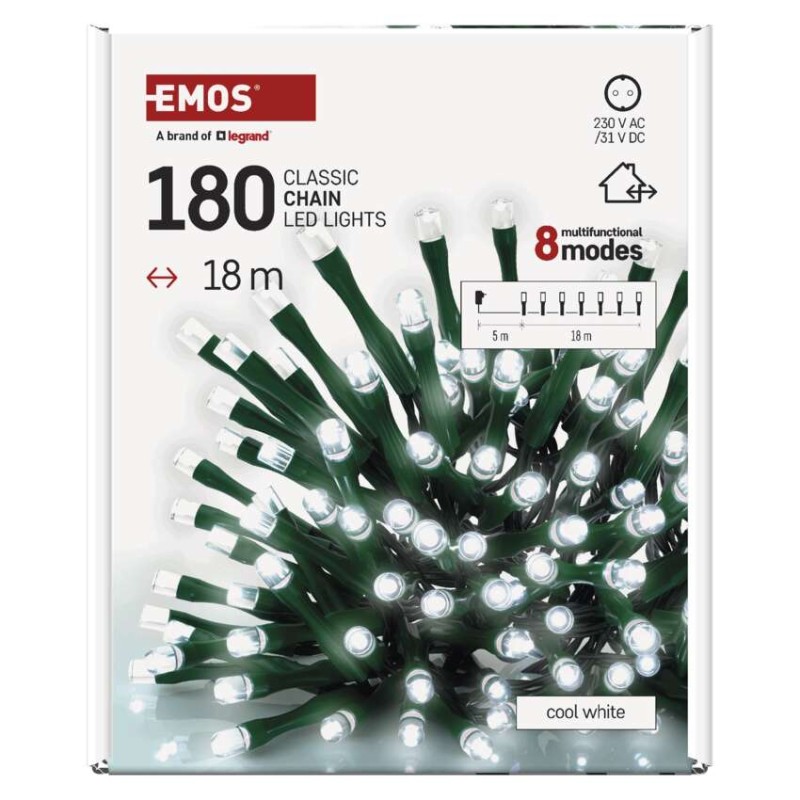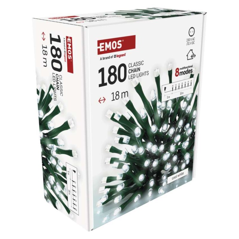 časovač: áno|ďalšie funkcie: –|diaľkový ovládač: nie|dĺžka prívodu: 5 m|farba drôtu: zelená|farba svetla: studená biela|funkcia: 8 módov (multifunkcie)|jazyky aplikácie: –|kompatibilita: –|krytie: IP44|LED medzera: 10 cm|materiál: PVC|možnosť prepojenia: nie|notifikácie do mobilnej aplikácie: nie|ovládanie hlasovými asistentmi: nie|počet LED: 180|podporované operačné systémy: –|použitie: vonkajšie aj vnútorné|predajný obal: 1 ks, krabica|prenosová frekvencia: –|pre výšku stromu: 200 cm|príkon: 3,6 W|produkt: reťaz|protokol: –|rozmer: 18 m|tvar: klasický|typ napájania: sieťový adaptér|veľkosť LED: 5 mm|vstupné napätie: 230 V AC|výstupné napätie: 31 V DC|záručná doba: 2 roky|životnosť: 10 000 hodín