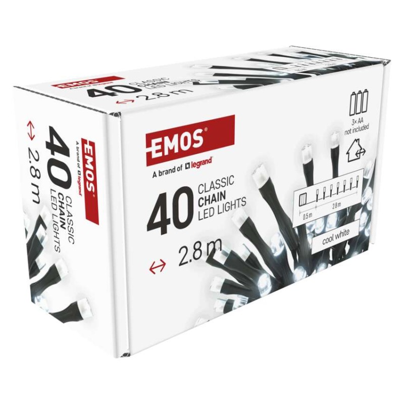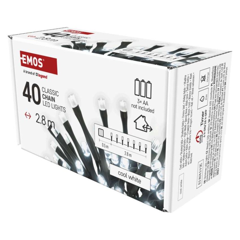 časovač: áno|diaľkový ovládač: nie|dĺžka prívodu: 0,5 m|farba drôtu: čierna|farba svetla: studená biela|funkcia: svieti|krytie: IP44|LED medzera: neuvádza sa|materiál: PVC|možnosť prepojenia: nie|počet LED: 40|použitie: vonkajšie aj vnútorné|predajný obal: 1 ks, krabica|pre výšku stromu: neuvádza sa|príkon: 0,5 W|produkt: reťaz|rozmer: 2,8 m|tvar: neuvádza sa|typ napájania: batéria (3× AA)|veľkosť LED: neuvádza sa|vstupné napätie: neuvádza sa|výstupné napätie: 4,5 V DC|záručná doba: 2 roky|životnosť: 10 000 hodín