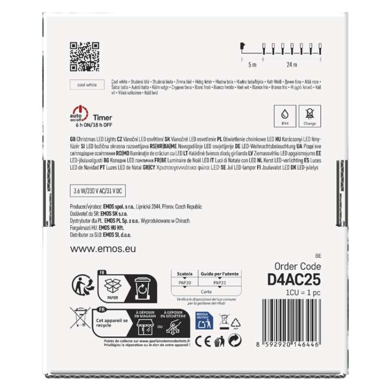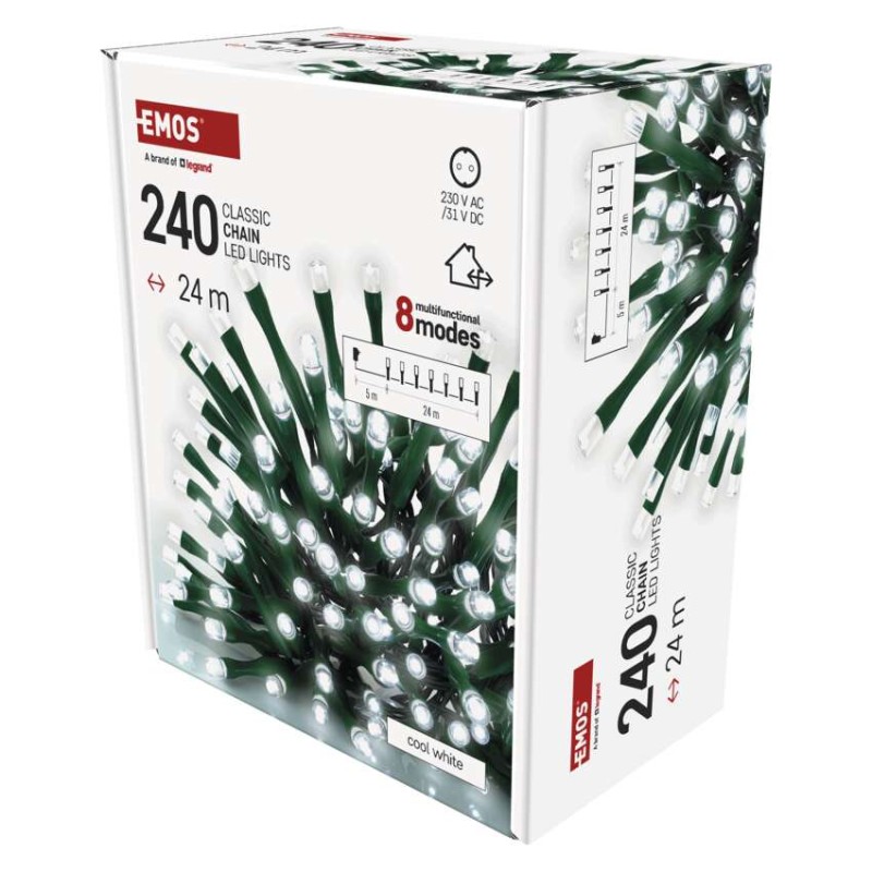 časovač: áno|ďalšie funkcie: –|diaľkový ovládač: nie|dĺžka prívodu: 5 m|farba drôtu: zelená|farba svetla: studená biela|funkcia: 8 módov (multifunkcie)|jazyky aplikácie: –|kompatibilita: –|krytie: IP44|LED medzera: 10 cm|materiál: PVC|možnosť prepojenia: nie|notifikácie do mobilnej aplikácie: nie|ovládanie hlasovými asistentmi: nie|počet LED: 240|podporované operačné systémy: –|použitie: vonkajšie aj vnútorné|predajný obal: 1 ks, krabica|prenosová frekvencia: –|pre výšku stromu: 230 cm|príkon: 3,6 W|produkt: reťaz|protokol: –|rozmer: 24 m|tvar: klasický|typ napájania: sieťový adaptér|veľkosť LED: 5 mm|vstupné napätie: 230 V AC|výstupné napätie: 31 V DC|záručná doba: 2 roky|životnosť: 10 000 hodín
