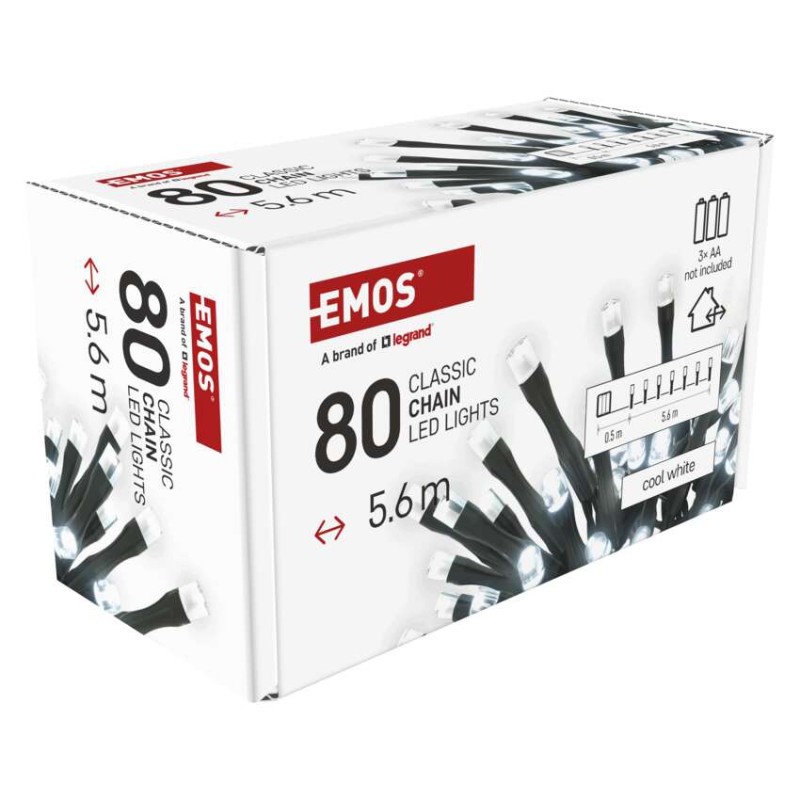 časovač: áno|diaľkový ovládač: nie|dĺžka prívodu: 0,5 m|farba drôtu: čierna|farba svetla: studená biela|funkcia: svieti|krytie: IP44|LED medzera: neuvádza sa|materiál: PVC|možnosť prepojenia: nie|počet LED: 80|použitie: vonkajšie aj vnútorné|predajný obal: 1 ks, krabica|pre výšku stromu: neuvádza sa|príkon: 0,9 W|produkt: reťaz|rozmer: 5,6 m|tvar: neuvádza sa|typ napájania: batéria (3× AA)|veľkosť LED: neuvádza sa|vstupné napätie: neuvádza sa|výstupné napätie: 4,5 V DC|záručná doba: 2 roky|životnosť: 10 000 hodín