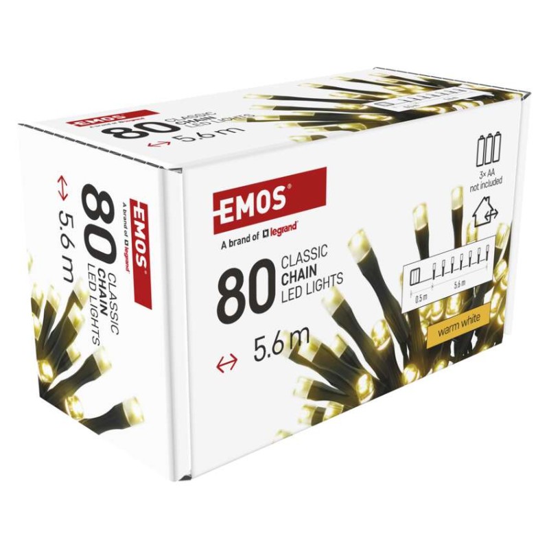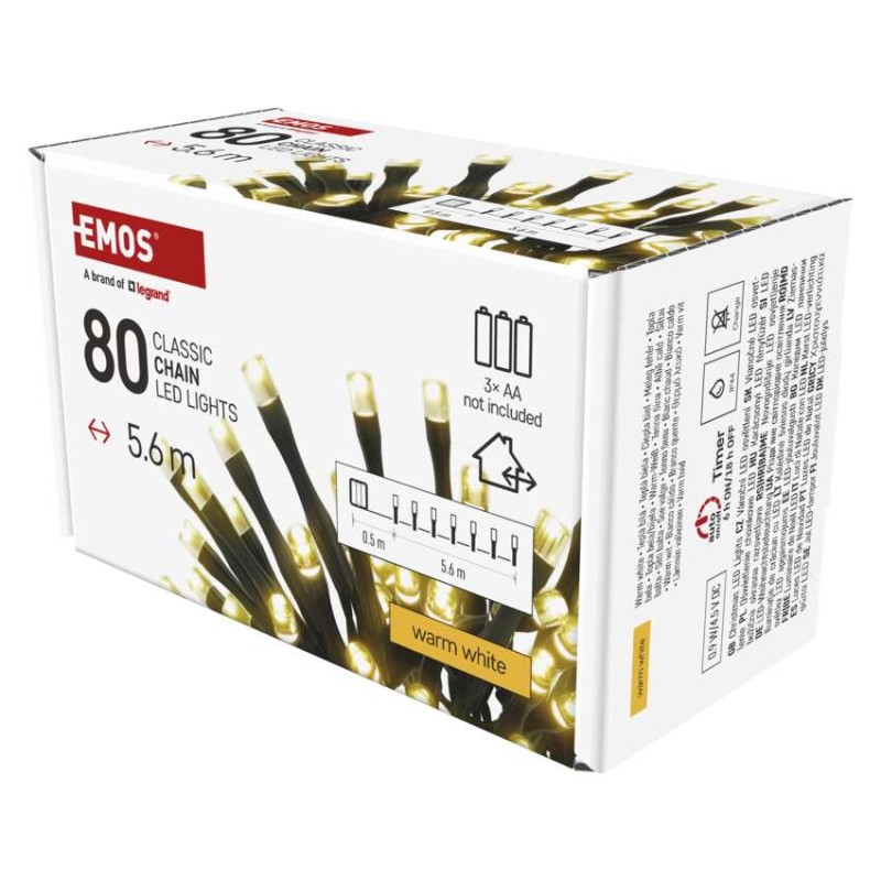 časovač: áno|diaľkový ovládač: nie|dĺžka prívodu: 0,5 m|farba drôtu: čierna|farba svetla: teplá biela|funkcia: svieti|krytie: IP44|LED medzera: 7 cm|materiál: PVC|možnosť prepojenia: nie|počet LED: 80|použitie: vonkajšie aj vnútorné|predajný obal: 1 ks, krabica|pre výšku stromu: neuvádza sa|príkon: 0,9 W|produkt: reťaz|rozmer: 5,6 m|tvar: klasický|typ napájania: batéria (3× AA)|veľkosť LED: 5 mm|vstupné napätie: neuvádza sa|výstupné napätie: 4,5 V DC|záručná doba: 2 roky|životnosť: 10 000 hodín