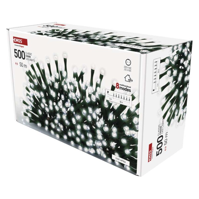 časovač: áno|ďalšie funkcie: –|diaľkový ovládač: nie|dĺžka prívodu: 5 m|farba drôtu: zelená|farba svetla: studená biela|funkcia: 8 módov (multifunkcie)|jazyky aplikácie: –|kompatibilita: –|krytie: IP44|LED medzera: 10 cm|materiál: PVC|možnosť prepojenia: nie|notifikácie do mobilnej aplikácie: nie|ovládanie hlasovými asistentmi: nie|počet LED: 500|podporované operačné systémy: –|použitie: vonkajšie aj vnútorné|predajný obal: 1 ks, krabica|prenosová frekvencia: –|pre výšku stromu: 300 cm|príkon: 6 W|produkt: reťaz|protokol: –|rozmer: 50 m|tvar: klasický|typ napájania: sieťový adaptér|veľkosť LED: 5 mm|vstupné napätie: 230 V AC|výstupné napätie: 31 V DC|záručná doba: 2 roky|životnosť: 10 000 hodín