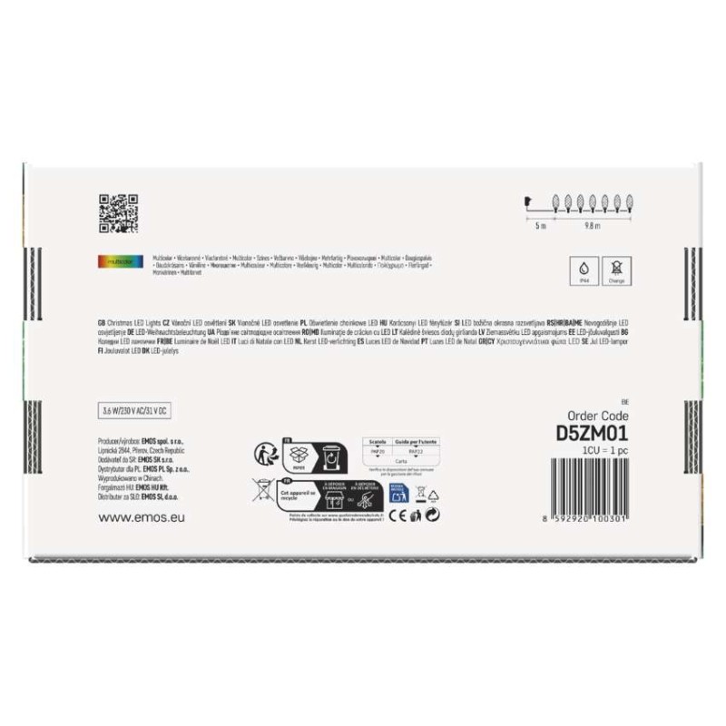 časovač: nie|diaľkový ovládač: nie|dĺžka prívodu: 5 m|farba drôtu: zelená|farba svetla: multicolor|funkcia: 8 módov (multifunkcie)|krytie: IP44|LED medzera: 20 cm|materiál: PVC|možnosť prepojenia: nie|počet LED: 50|použitie: vonkajšie aj vnútorné|predajný obal: 1 ks, krabica|pre výšku stromu: neuvádza sa|príkon: 6 W|produkt: reťaz|rozmer: 9,8 m|tvar: sviečka|typ napájania: sieťový adaptér|veľkosť LED: neuvádza sa|vstupné napätie: 230 V AC|výstupné napätie: 24 V DC|záručná doba: 2 roky|životnosť: 10 000 hodín