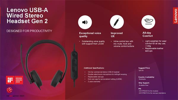 Lenovo, USB-A Wired Stereo Headset Gen 2 Lenovo, USB-A Wired Stereo Headset Gen 2