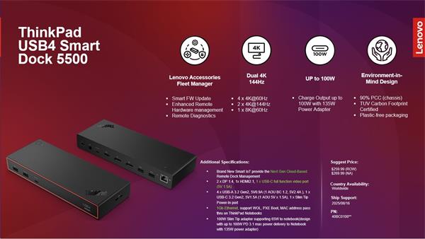 Lenovo ThinkPad USB4 Smart Dock 5500 - PD65W (2x DP, 1x HDMI, 1x RJ45, 1x USB-C,4xUSB-A adapter) pripojit max 40BC0100EU