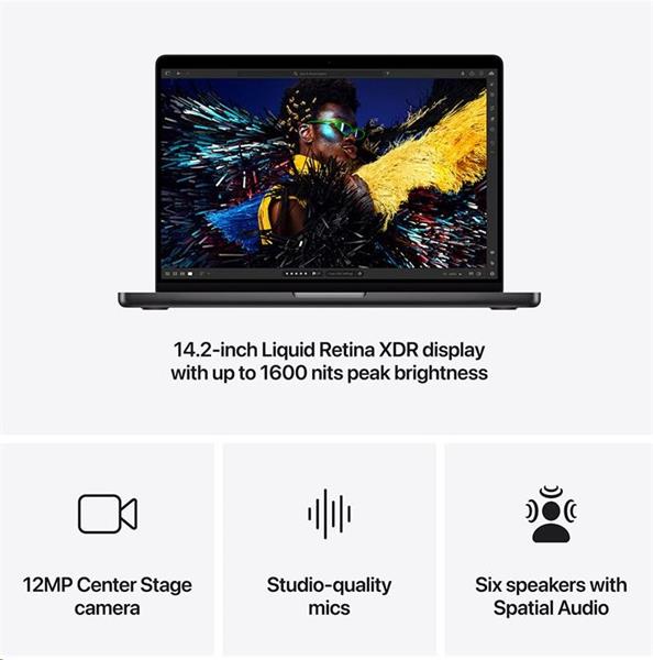 Displej Liquid Retina XDR 14,2-palcový (uhlopriečne) Natívne rozlíšenie 3024 x 1964 pri 254 pixeloch na palec XDR (Extrémny Dynamický Rozsah) Kontrastný pomer 1 000 000 : 1 XDR jas: 1 000 nitov (celá obrazovka), najviac 1 600 nitov (iba HDR) SDR jas: 1...