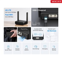 • Mercusys MB113-4G WiFi4 router (N300, 4G LTE, 2,4GHz, 1x100Mb/s LAN/WAN,1x100Mb/s LAN,1xnanoSIM)