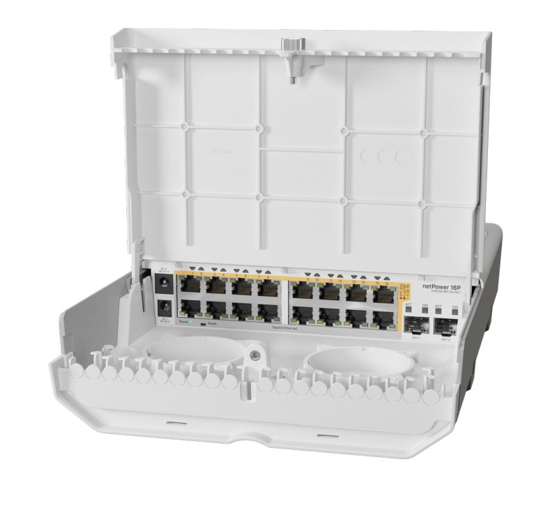 Powering a bunch of access points or IP cameras and a few uplinks on a tower has never been easier. netPower 16P has 16 Gigabit Ethernet ports with PoE-out and two SFP+ ports for 10G fiber uplinks.