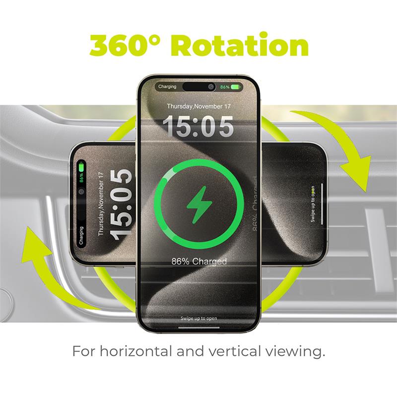 Magnetická bezdrôtová nabíjačka do auta - elegantný a kompaktný dizajn vhodný do každého auta - vstavané, silné magnety 16X N52 pre MagSafe a Qi kompatibilitu - pevný magnet udrží iPhone bezpečne pripevnený aj počas nerovností na ceste - možné nabíjanie vo vertikálnej alebo horizontálnej polohe - rýchle bezdrôtové nabíjanie s výkonom 15 W a ochranou proti prehriatiu a prepätiu - upevnenie držiaka určené do ventilačnej mriežky v aute pomocou kovového háku - kompatibilné s iPhone 12 a novším Obsah balenia: 1x Bezdrôtová magnetická nabíjačka MO3 1x USB-C / USB-C kábel 1 m 1x Používateľská príručka