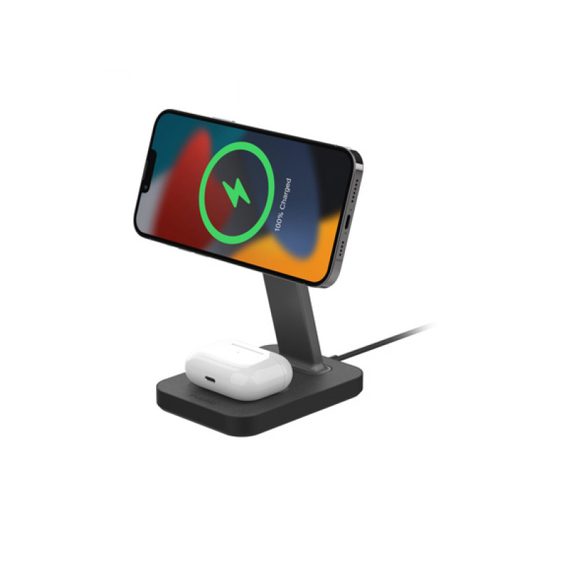 Bezdrôtový nabíjací stojan 2v1 kompatibilný s MagSafe, ktorý vám umožní dobíjať smartphone a AirPods súčasne.