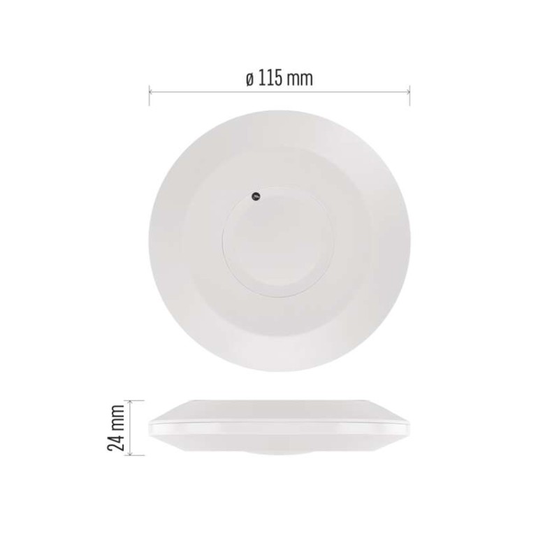 citlivosť: <3 Lux|ďalšie funkcie: –|detekčný dosah: 8 m|detekčný uhol: 360°|doba zopnutia: min. 10 sekúnd – max. 12 minút|farba: biela|hlasová komunikácia: –|inštalačný materiál: –|jazyky aplikácie: –|kompatibilita: –|krytie: IP20|max. záťaž kapacitná: 1 000 W|max. záťaž odporová: 2 000 W|napájanie: 220–240 V~|notifikácie do mobilnej aplikácie: –|ovládanie hlasovými asistentmi: –|podporované OS: –|predajný obal: 1 ks, krabička|prenosová frekvencia: –|produkt: pohybové čidlo|protokol: –|rozmer: 115 × 115 × 24 mm|typ senzora: mikrovlnný|ukladanie na cloud: –|ukladanie na kartu SD: –