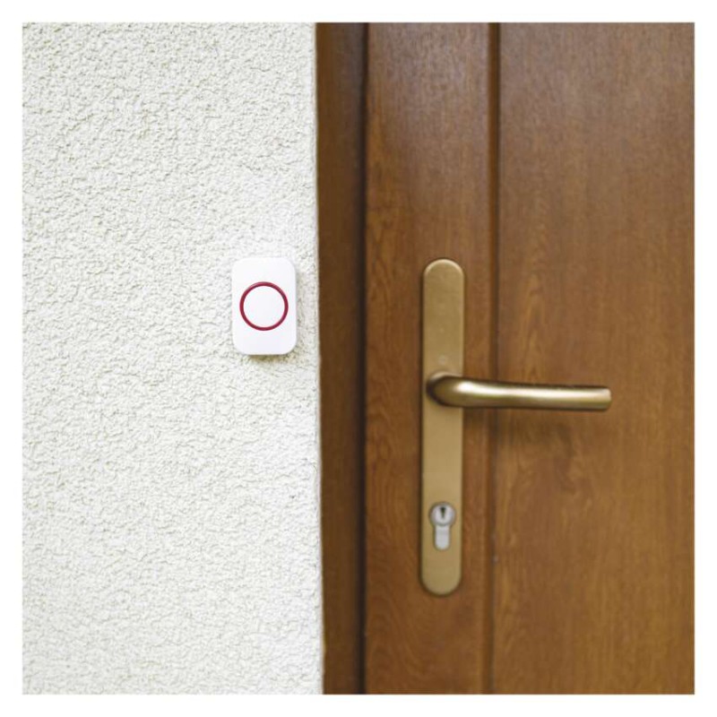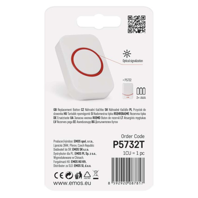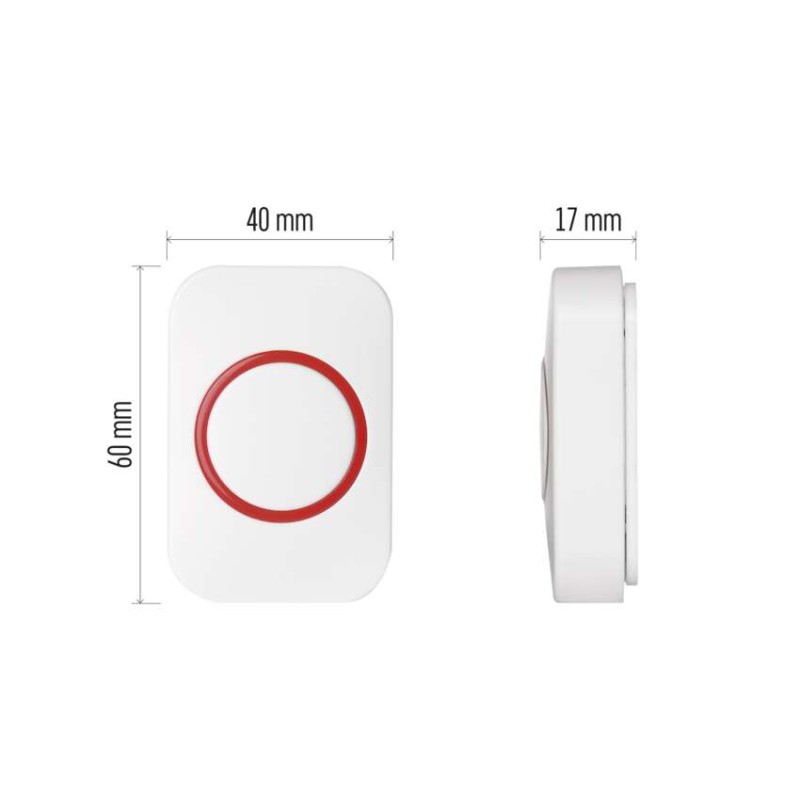 dosah vo voľnom priestore: až 100 m|krytie: IP44|napájanie: 1× 3 V CR2032 (súčasťou balenia)|predajný obal: 1 ks, blister|prenosová frekvencia: 433 MHz|spôsob párovania: self-learning (automatické napárovanie)|spôsob prenosu: bezdrôtovo|určené pre typ zvončeka: P5732