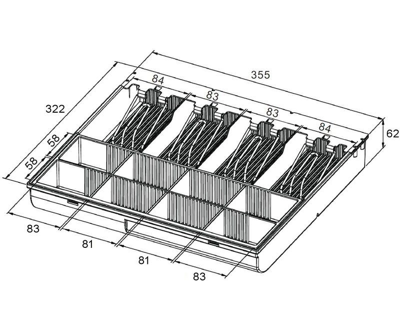 Slouží k ukládání mincí, dodatečně lze zakoupit nastavitelné přepážky pro zvýšení počtu přihrádek pro jednotlivé mince. Rozměry: 361 (Š) x 45 (V) x 125 (H) mm