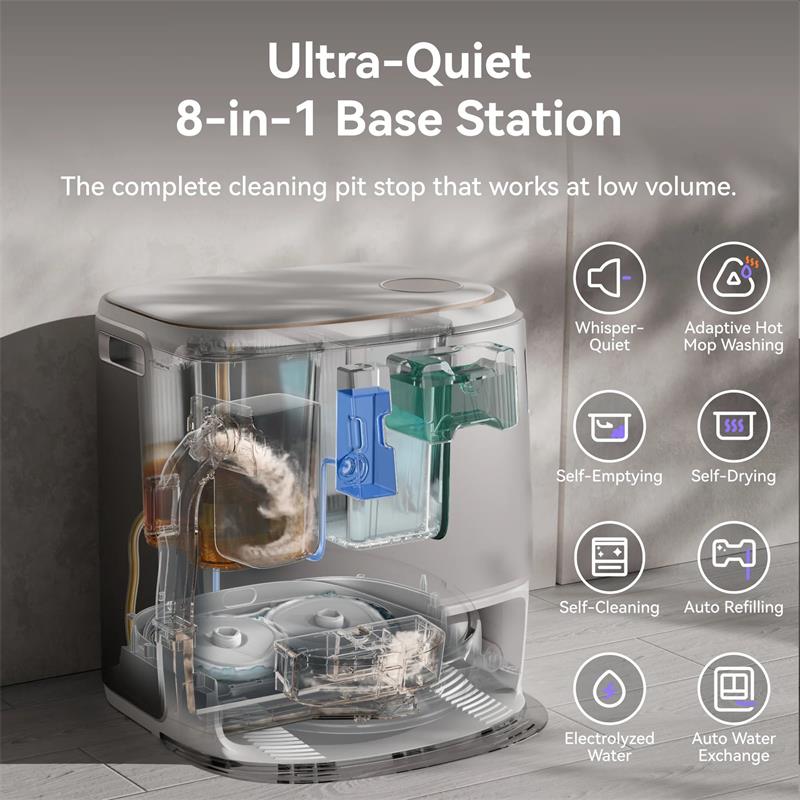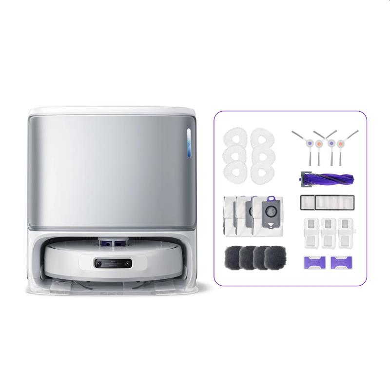 Tiež súčasťou balenia : Napájací kábel základňovej stanice*1, Predlžovacia rampa*1, Filter nádoby na prach*1, Modul na čistenie základnej dosky*1, Vymeniteľná vložka kôš*1, Produktová príručka*1.