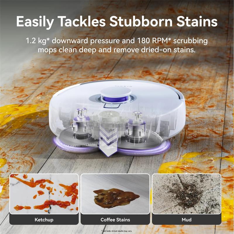 Dvojité mopy napodobňujú ručné čistenie a tlak smerom nadol, aby odstránili aj tie najodolnejšie škvrny, vrátane 72 hodín starého kečupu, kávy a džemu.