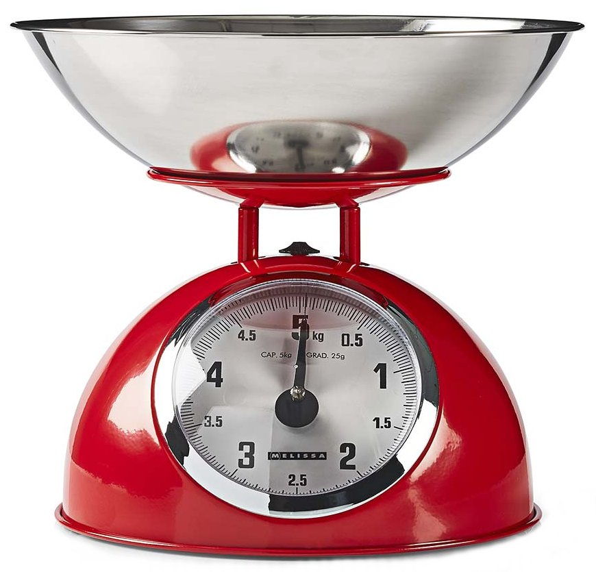 Stylová analogová kuchyňská váha s retro designem a praktickou vyjímatelnou mísou.