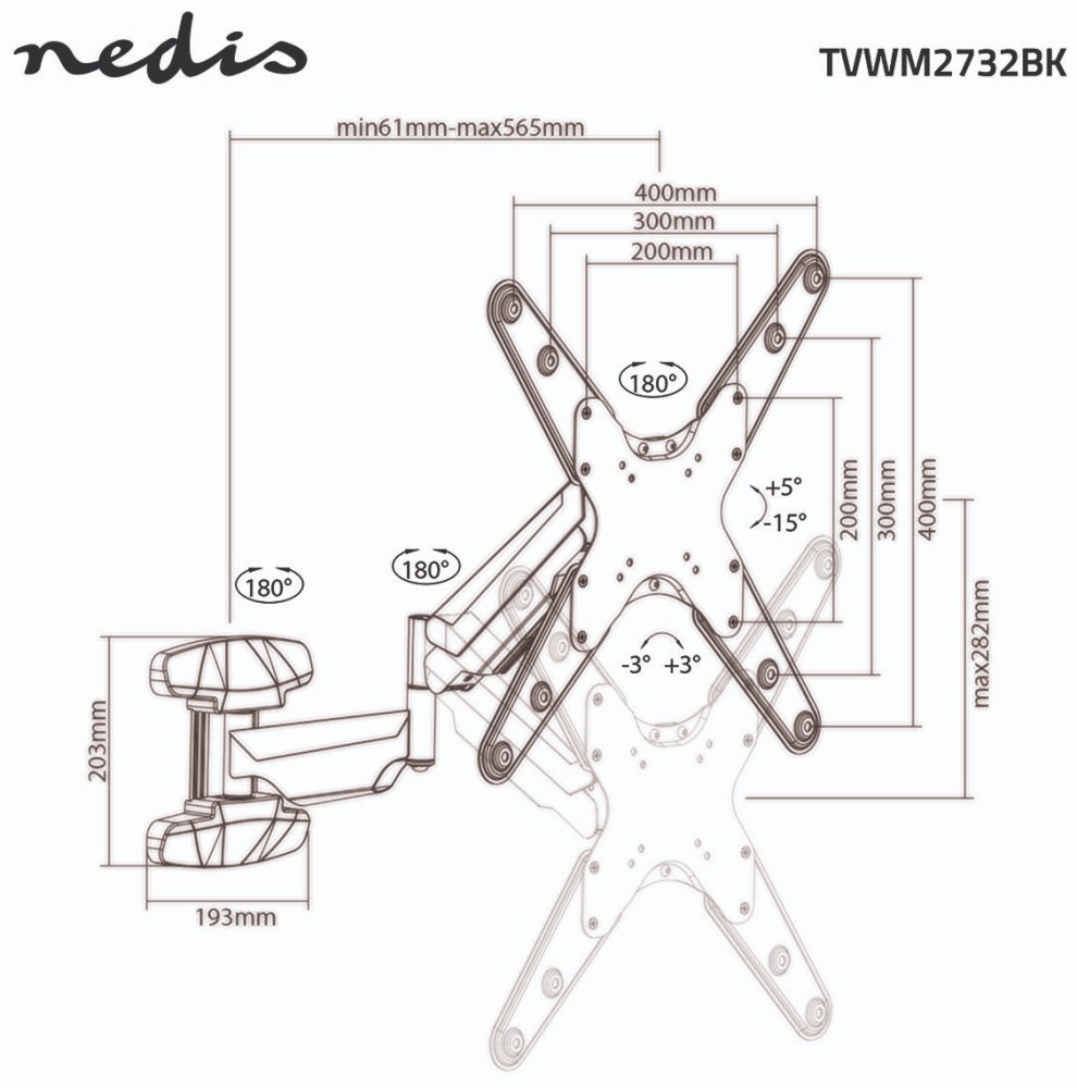Tento vysoce flexibilní vertikální nástěnný držák nabízí kompletní řešení pro optimální umístění televizoru v jakékoliv místnosti. Díky třem otočným bodům umožňuje rotaci až 180°, naklápění v rozsahu 15° a plynulé nastavení vzdálenosti od stěny mezi 61 až 565 mm.