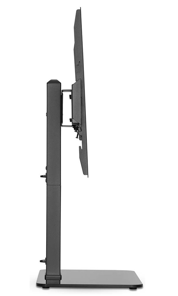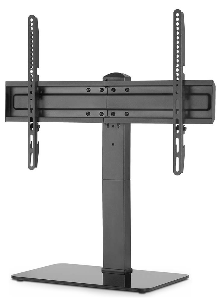 Výškově nastavitelný stolní stojan je vhodný pro televizory s úhlopříčkou 37" až 70". Nabízí vertikální nastavení výšky ve 3 polohách a otáčení o –35° až +35° pro dokonalý úhel pohledu z jakéhokoli místa v místnosti. Podstavec z tvrzeného skla o tloušťce 8 mm zajistí pevnou a spolehlivou oporu. Samozřejmostí pak je integrovaný systém správy kabelů.