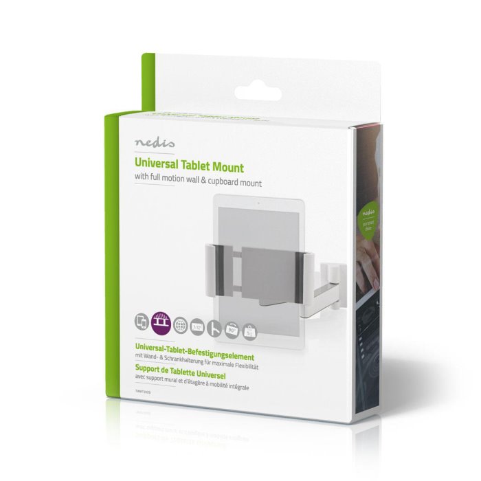 Připevněte držák na stěnu nebo pod skříňku a získejte tak kdekoli v domácnosti plně nastavitelný stojan na tablet, který umožňuje naklánění a horizontální i vertikální otáčení. Držák je dodáván s veškerým potřebným montážním materiálem a je vybaven funk