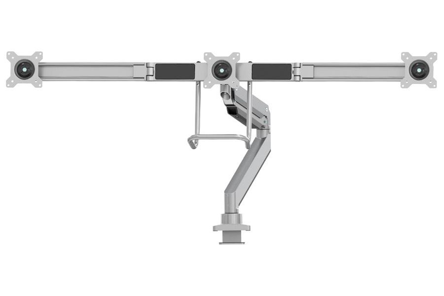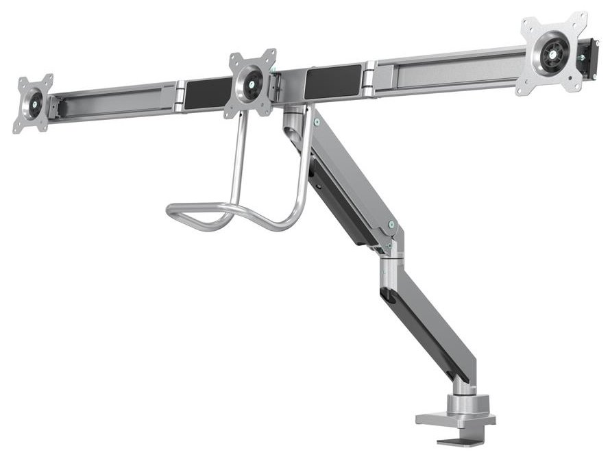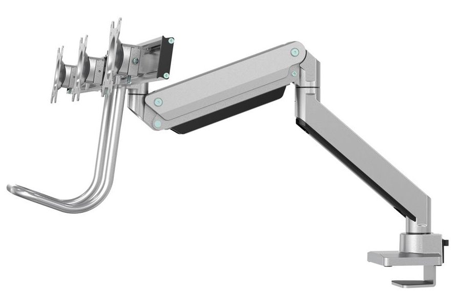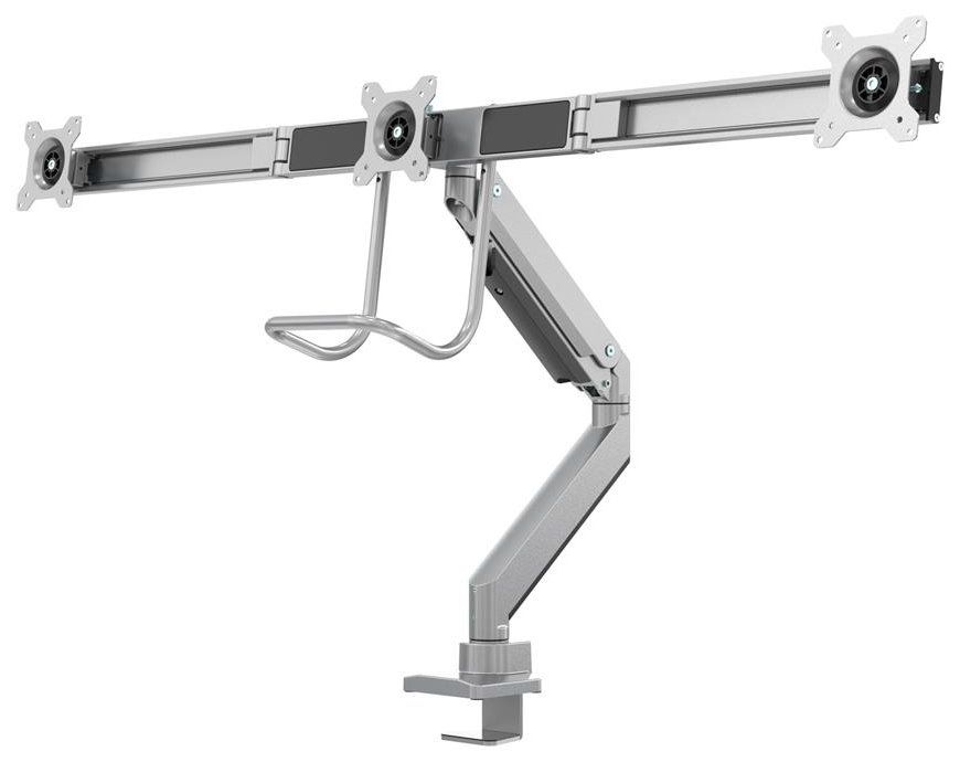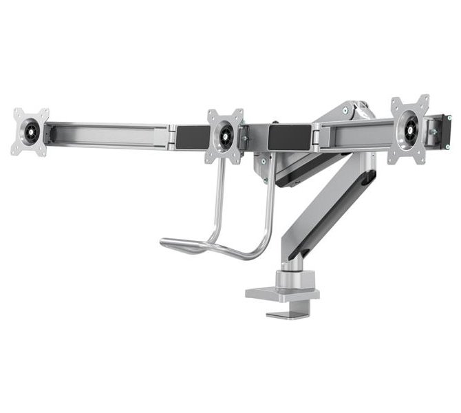 Držák, VESA, stolní, pro 3 ploché monitory, úhlopříčka 17"-27", náklon 20°, otáčení 360°, rotace 360°, nosnost 18kg, stříbrný