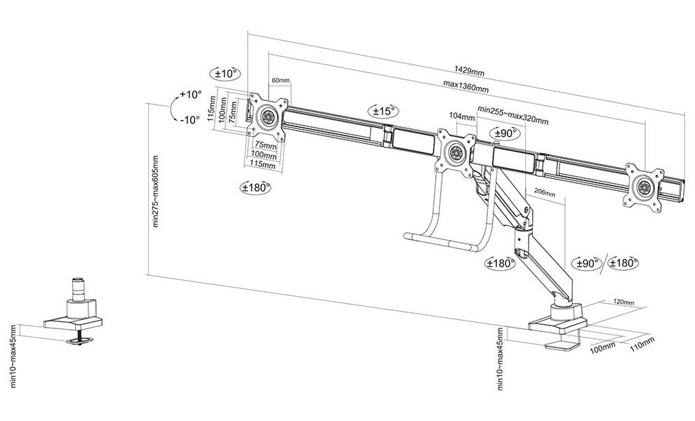 Flexibilní stolní VESA držák s rukojetí pro 3 ploché monitory o velikosti 17" - 27" a maximální nosnosti do 18 kg (3x 6 kg). Univerzální technologie naklápění, otáčení a rotace umožňuje optimální nastavení. Veškerý instalační materiál je součástí výrobku.