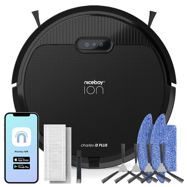 Robotický vysavač Niceboy ION Charles i3 Plus s mopováním a technologií Hurricane PRO má sací výkon 2300 Pa. Gyroskopická navigace, antikolizní senzory a filtrační systém MAX Clean zajistí efektivní a bezpečný úklid s účinností 99,97 %.